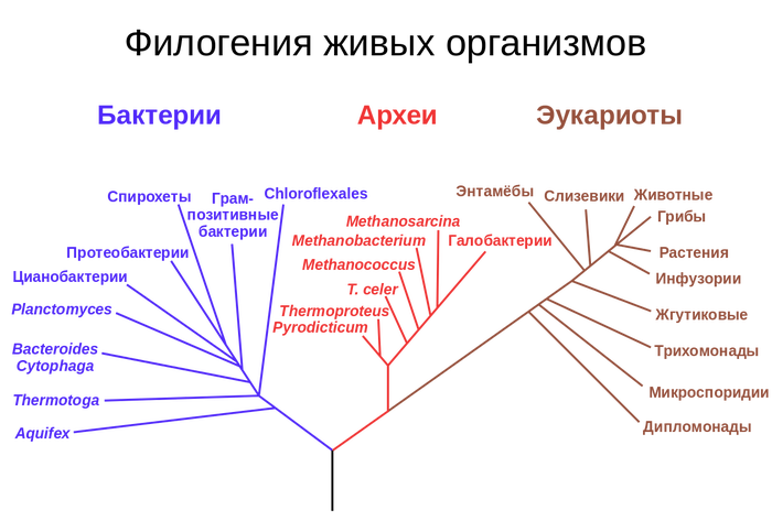 Самая популярная сегодня модель деления живого мира была впервые предложена в 1977 г. Карлом Воузом (Carl Woese). На основании анализа генов рибосомальной РНК он заключил, что все живое подразделяется на три царства, или домена (последний термин был введен в 1990-х): бактерии, археи и эукариоты. Бактерии и археи (объединяемые также под термином «прокариоты») внешне похожи – например, ни у тех, ни у других нет ядра. Но при этом они сильно различаются деталями молекулярного строения. По некоторым признакам археи ближе к эукариотам, к которым относятся все организмы с клеточным ядром, включая животных, растений и грибов.