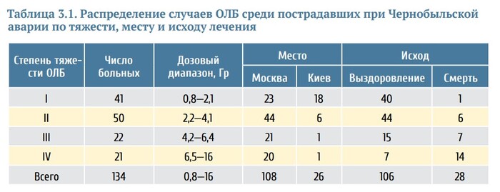 Во-первых, даже в 1986 году, при ликвидации последствий аварии, диагноз острой лучевой болезни (ОЛБ) разной степени был подтвержден лишь у 134 человек (данные ООН, или ИБРАЭ) из сотен и тысяч, работавших непосредственно вблизи разрушенного энергоблока в первые дни после аварии. Среди нескольких сотен тысяч ликвидаторов, работавших в последующие годы на ликвидации последствий аварии на станции и в зоне отчуждения ОЛБ отмечено не было.