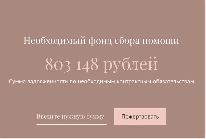 Ниже расположена и форма для внесения пожертвований. Общая суммы сбора на четверых человек составляет 803 148 рублей. Под цифрами есть приписка, которая поясняет, что эта сумма равна задолженности по необходимым контрактным обязательствам. Иными словами, ровно столько четверо адептов школы должны заплатить ей за свое духовное обучение. Пожертвовать можно любую сумму, стоимость взноса нефиксированная.