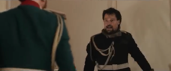Но через секунду Матильда с визгом возвращается и прячется за Николаем. В палатку врывается безумный Козловский в маске Кайла Рена, который сняв маску, в лютой злобе, аки Викинг под грибами, истерично визжит и бьет наследника по его августейшей морде, за то что тот украл его бабу. Истерично визжащего Козловского утаскивают казаки.