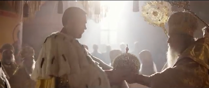 Матильда забегает на клирос, где стоят певчие и захлопывает перед усатым офицером дверь, после чего кричит на весь собор: "Никки я твоя навеки". Увидев Матильду, Николай пугается и падает в обморок, при этом роняет на пол корону. Ну это по видимому по задумке режиссера, должно означать символизм падения дома Романовых