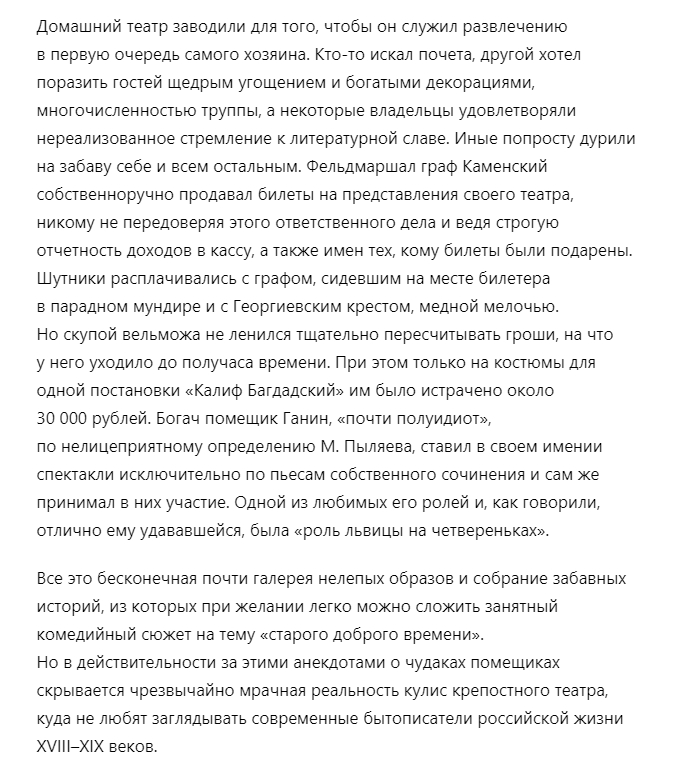 Начавшись как забава, очень скоро увлечение театральными представлениями приобретает характер настоящей страсти. Однако, как и во всем дворянском быте эпохи крепостничества, и здесь понятие собственности, определение «свое» имеет решающее значение. Театр, конечно, хорош, но престижнее всего иметь именно собственный театр, своих актеров.