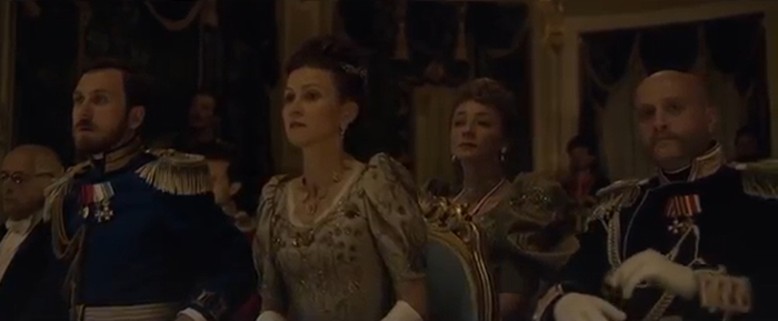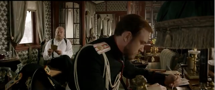 В императорском вагоне сидит Александр Третий и рассматривает фотографии Матильды, потом подходит к Николаю и говорит, что вот такая баба наследнику престола нужна, а не какая то там немка.