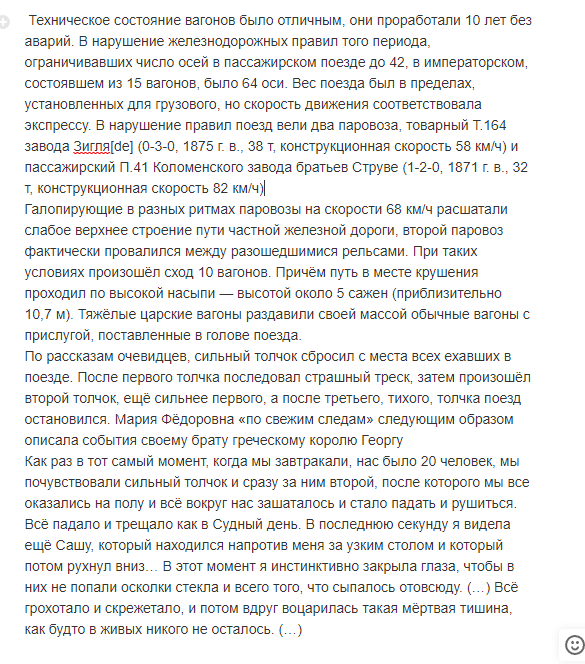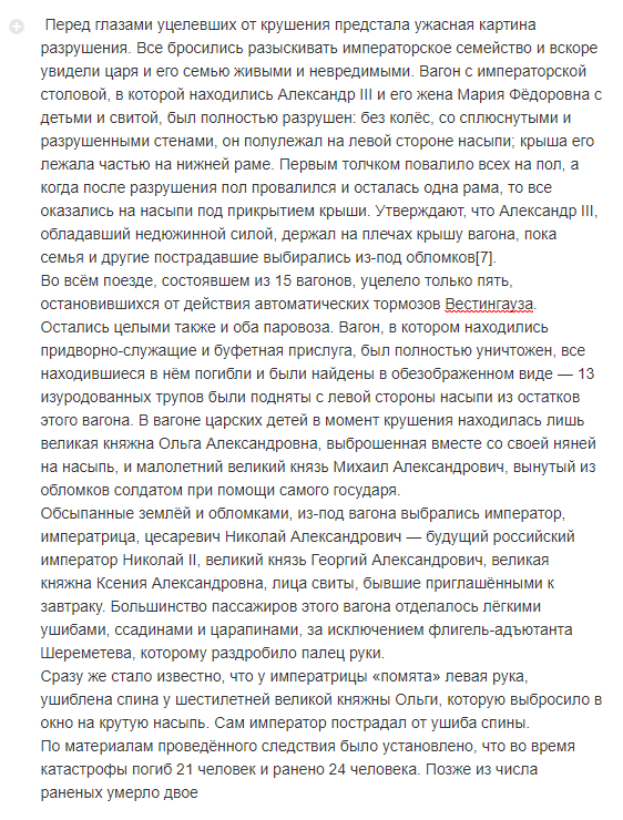 На самом деле в момент крушения поезда стены вагона сдвинулись и задержали падение крыши. Кстати Витте, на момент написания им мемуаров, были прекрасно известны результаты тщательного расследования катастрофы специальной комиссией под председательством известного юриста А. Ф. Кони.
