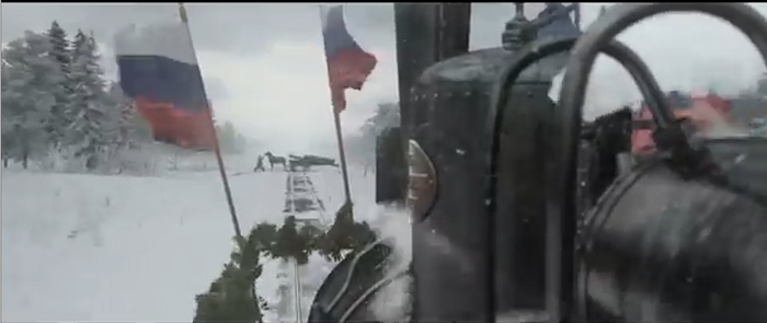 Волшебный российский монтаж и вот уже после лета наступает зима, ну видимо других времен года в России нету. По путям едет нарисованный царский поезд, зачем-то увешанный государственными флагами под самую завязку.
