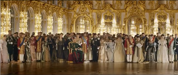 После чего ведет Матильду в зал, где собрался весь двор, в том числе его папа на кресле каталке. Все в шоке, как это так, привел постороннюю даму в зал и это после помолвки. Царь, полюбовавшись шоком, ехидно так улыбается и говорит, что наследника надо поздравить - и все дружно приветствуют наследника.