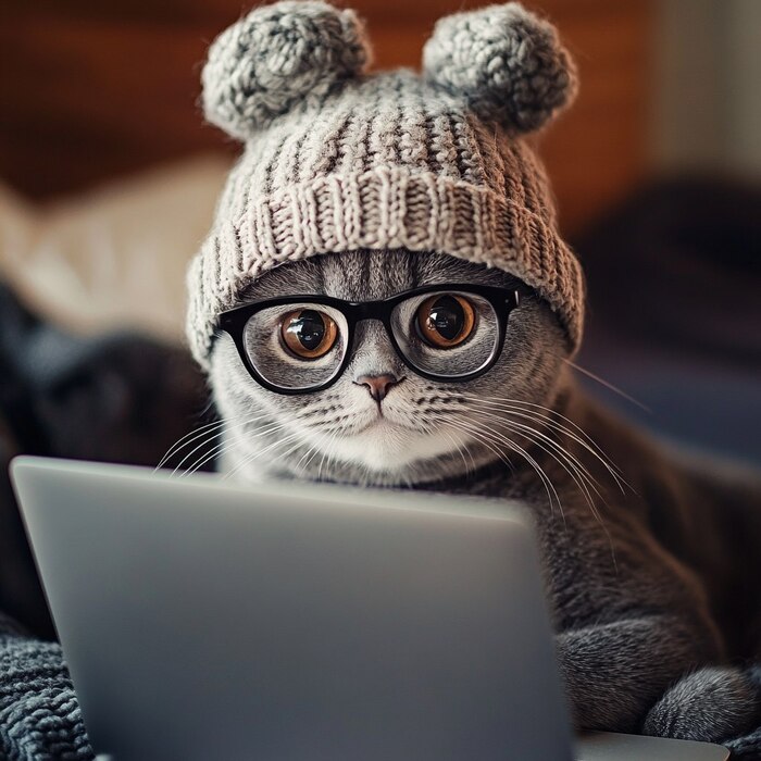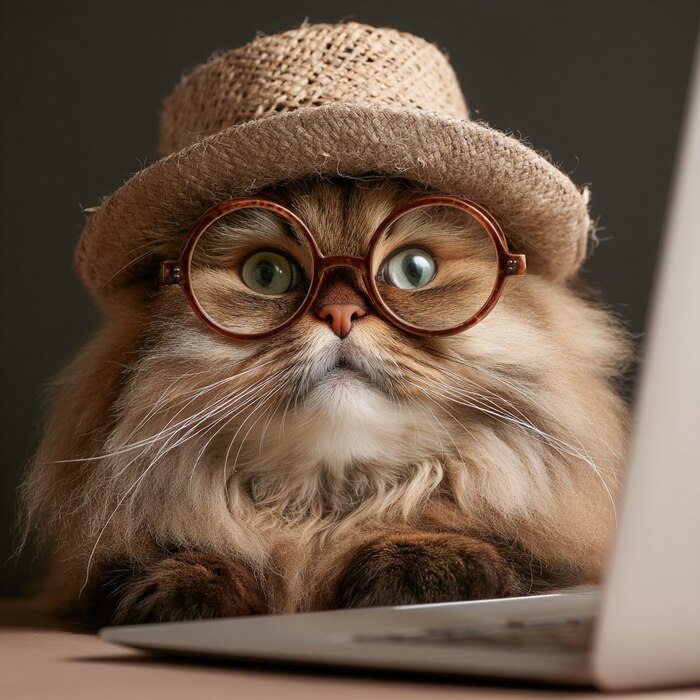 "Кот в шляпе и очках, сидит за ноутбуком"