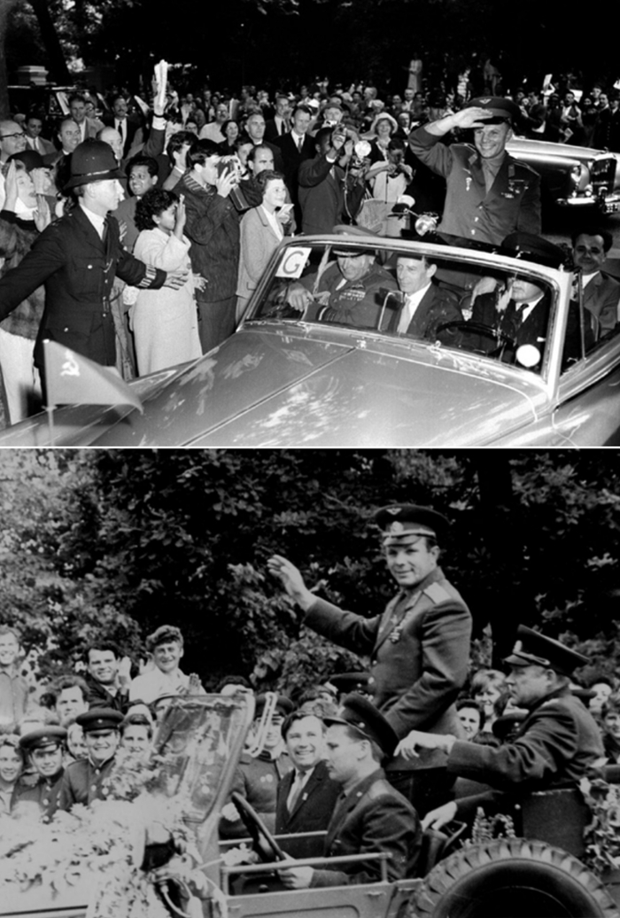 Митинг перерос в стихийную 3-часовую демонстрацию, которую Юрий Гагарин и руководители советского государства приветствовали с трибуны мавзолея Ленина. После окончания демонстрации Никита Хрущев проводил Гагарина внутрь мавзолея, к саркофагу. Торжества продолжились на приеме в Кремле, на котором присутствовали многие конструкторы, имена которых тогда еще официально не назывались. Леонид Брежнев вручил Гагарину «Золотую Звезду» Героя Советского Союза и орден Ленина. Многих новорожденных мальчиков родители называли в тот день в честь Гагарина - Юрием. Юрий Гагарин в рамках зарубежных визитов посетил около 30 стран.