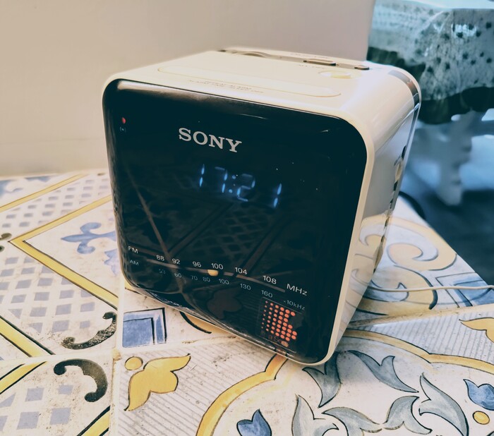 И вдруг взгляд цепляется — винтажный радиобудильник. Кубик. Сразу — флешбек: Сонька из 80-х, с механической шкалой, будто на подводной лодке нащупываешь волну. Чистый советский модерн. Сквозь пыль времени — как будто смотрит в глаза.