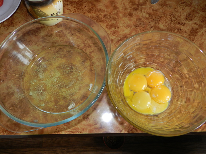 Яйца разделить на белки и желтки.