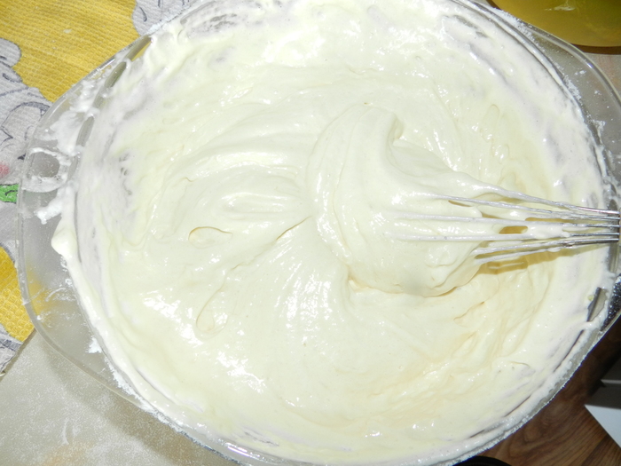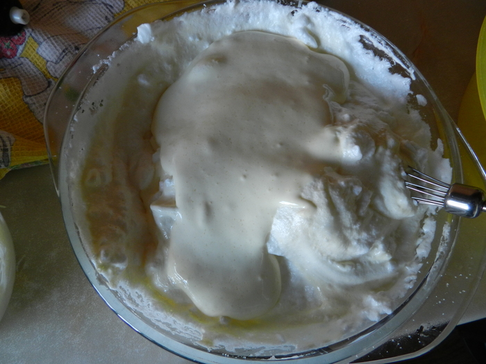 Примерно за три - четыре раза ввести муку, просеяв ее предварительно с разрыхлителем.