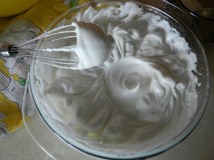 Добавлять по столовой ложке сахар, постоянно взбивая, половину от общего количества, до состояния устойчивых пиков.