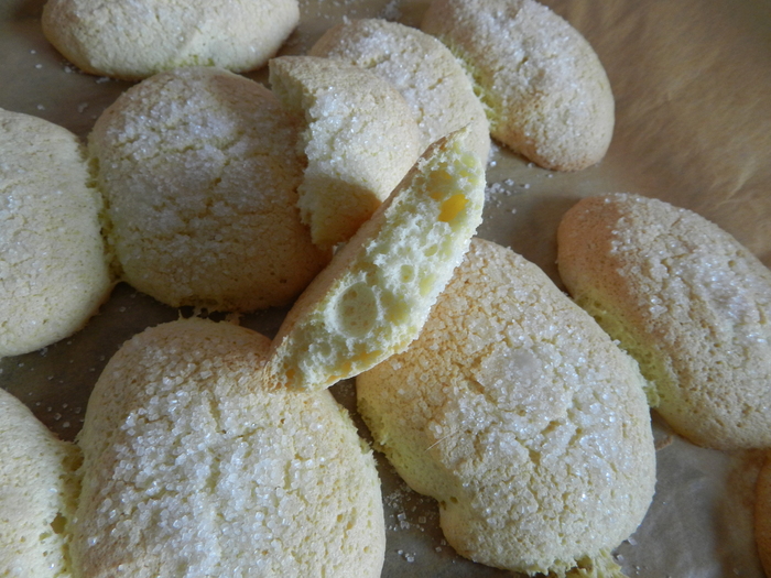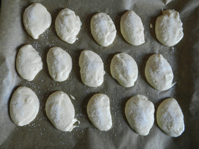 На противень пергамент, ложкой выкладываю печенья. Сверху присыпаю или сахаром или сахарной пудрой, минут через 7 второй раз.