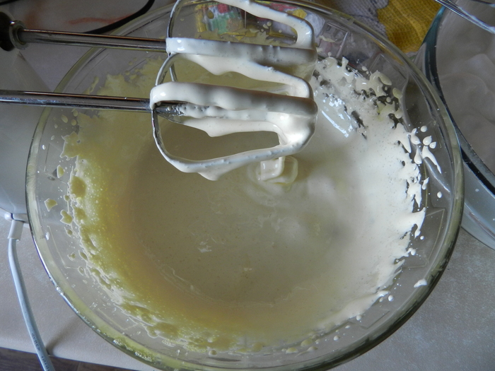 Взбить желтки и также постепенно добавляя вторую часть сахара довести их до