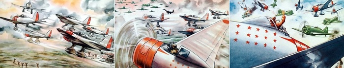 Две открытки изображают нанесение обозначений побед и очередной взлёт по тревоге. В японской авиации не было устоявшихся традиций для отметки сбитых вражеских самолётов, и опознавательные знаки противника были лишь одним из вариантов.