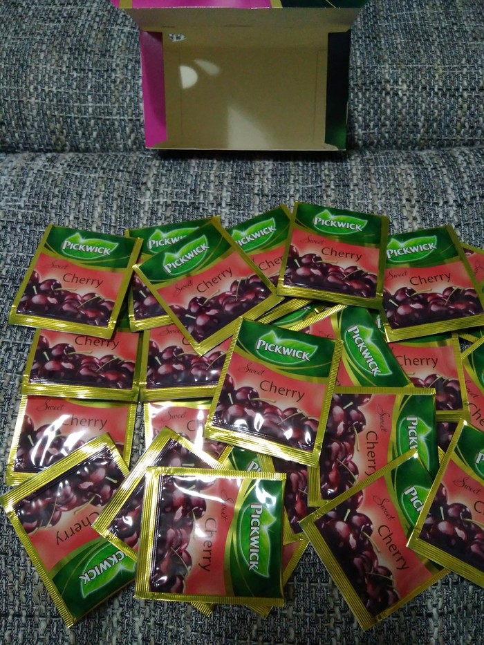Недавно нашла свой любимый чай πквик ассорти. Да, там есть в том числе вишня, ну , думаю, несколько пакетиков мужу презентую.