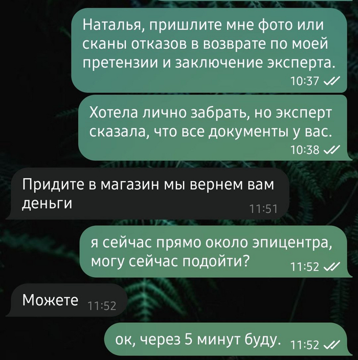 Выйдя, посидев в парке рядом, перекурив и обдумав ещё раз эту ситуацию, я решила вернуться и забрать письменный отказ в возврате ДС, а так же заключение эксперта. Но эксперт сказала, что владелец ИП уже всё забрала и уехала, поэтому мне ничего не оставалось, кроме как написать ей и попросить предоставить мне фото или сканы этих документов.