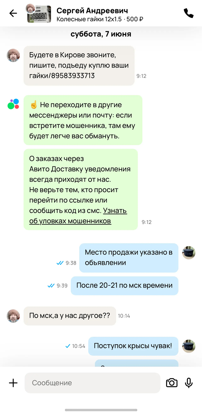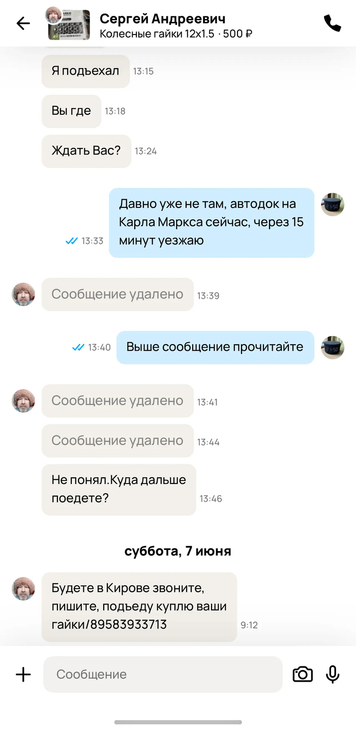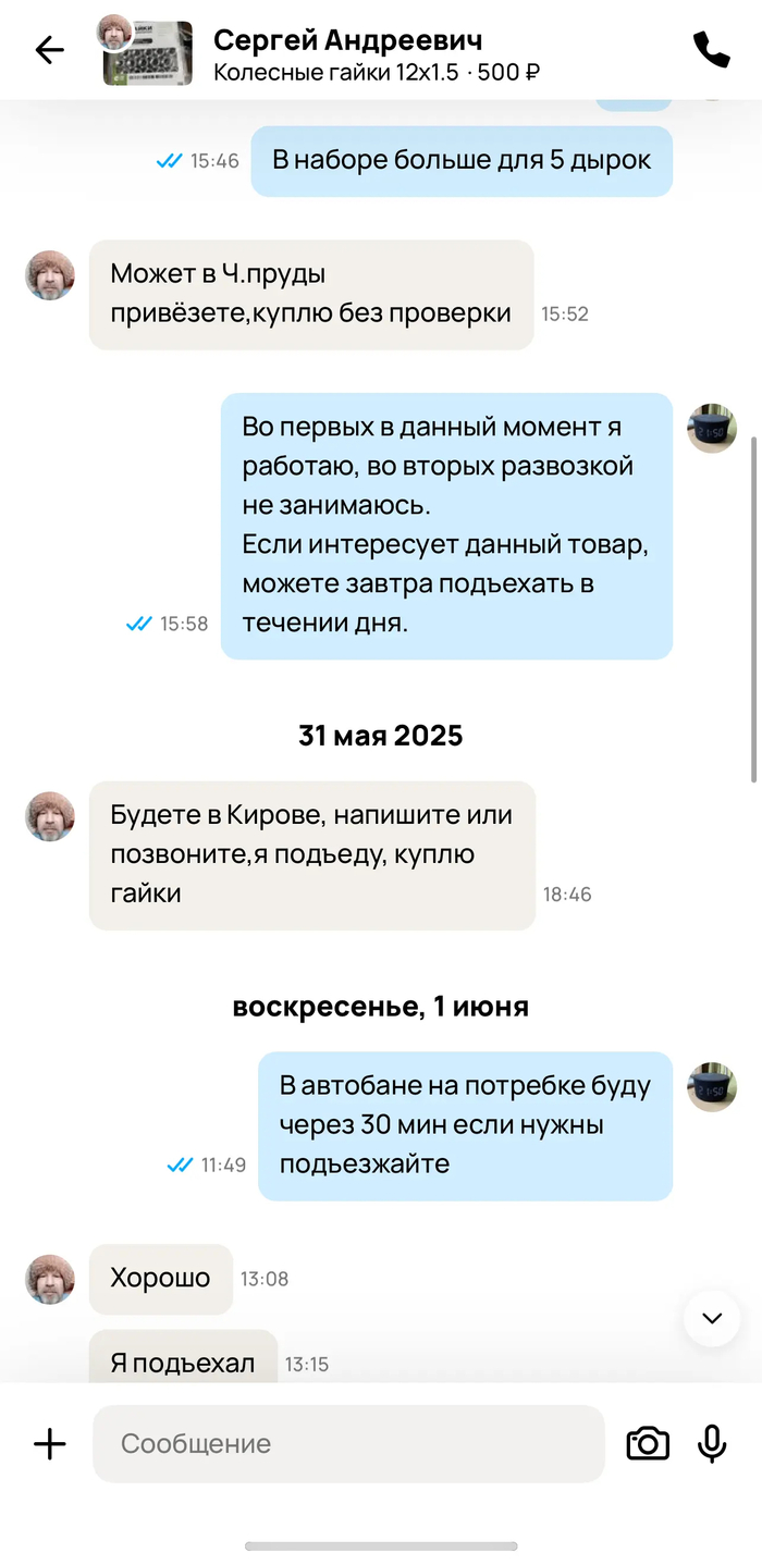 Написал мне один человек, хотел купить гайки за 500 рублей, и просил привести ему в другой район города.