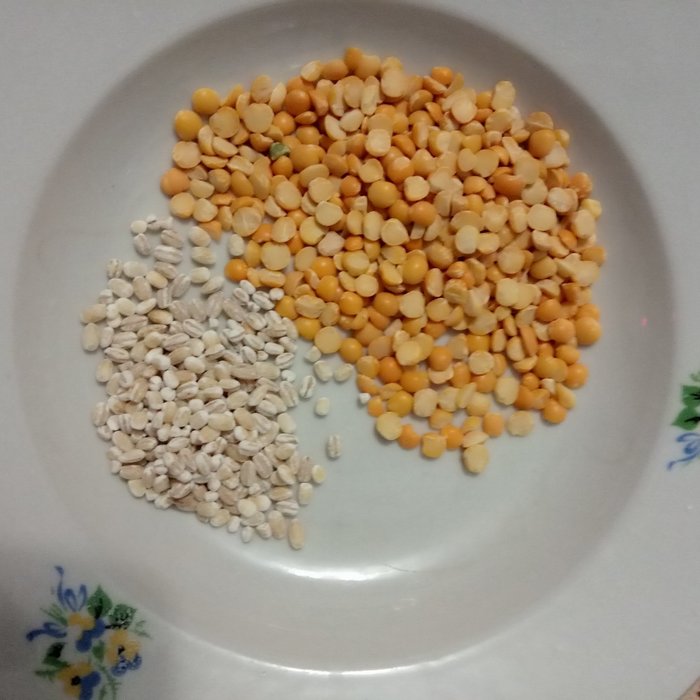 Бедновато. Но это не страшно. После того, как всё сварилось, бросаем туда горох и перловку. В моем случе - сразу с овощами. Важный момент - крупы стоит замочить в кипятке часа за два. Ну или просто залить водой на ночь. Воду сливаем, крупу - в бульон.