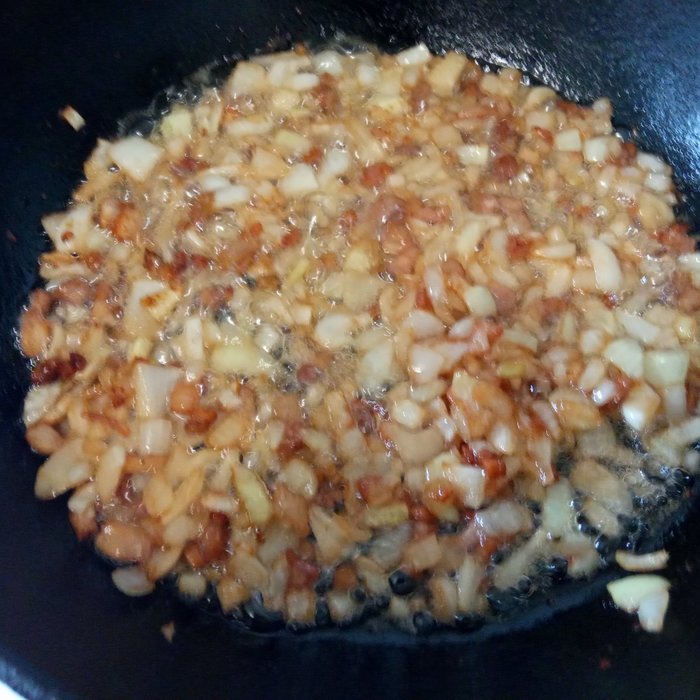 Варить нужно долго. Но оно того стоит. Я рекомендую не менее 40-50 минут. Лучше 50-60. Хотя я люблю это дело разварить как следует. Тут уж как хотите. Но что перловка, что горох варятся не быстро, сами понимаете. Хрустеть ими совсем не в радость. Пока это всё варится, готовим зажарку. Тут всё более-менее стандартно. Если есть сало(нет - переходим к следующему пункту) - вытапливаем из него жир.