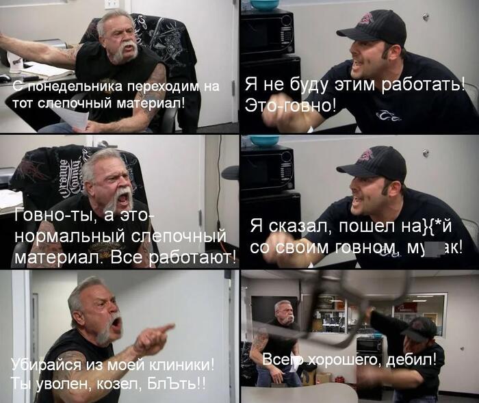 Поработав немного, я начал понимать детей того доктора. Жадность у Семеныча была возведена в абсолют. Экономил он в клинике на всём. Если ему предложат нормальный материал за 10 рублей и говно за 9.5, то второй вариант будет выбран не раздумывая. Например, шовный материал использовался самый дешевый, который есть на рынке. Плевать, что он на себе цепляет всю пищу, плевать, что неудобно, зато дешево. Вменяемый шовник выдавался под роспись только на сложные операции. Да, мой дорогой читатель, за хрень, которая стоит рублей 100 надо расписаться. Огромная беда была и с запчастями для имплантатов. Сами имплантаты он покупал как можно дешевле, причем по акциям, оптом. Если какая-то фирма предлагала дешевле, то он брал её, уточняя можно ли ставить там же набором инструментов. Приходилось колхозить. А вот от запчастей ортопеды плакали кровавыми слезами. Он брал самодельные абатменты, изготовленные литьем за 300 рублей, хотя фрезерованные, хоть и не оригинальные, стоят рублей 700-1500. Это при том, что имплантат под ключ стоял 50 тыс. Эти абатменты, а также паленые фиксирующие винты постоянно ломались. Коронки были убогие, ни хрена не надевались, потому что изготовлены были в самой дешевой зуботехничке из самых дешевых материлов по слепкам из самого дешевого силикона. Короче, недовольных пациентов было много, небезосновательно.
