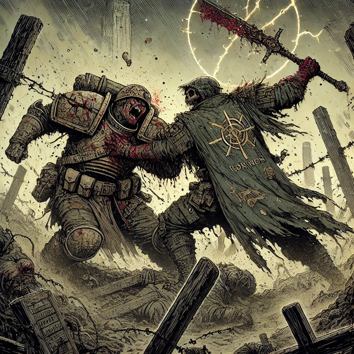 Когда бой затих, Азарий, пробираясь через траншеи, увидел его. Феликс стоял на другом конце окопа. Он выглядел истощённым: его лицо осунулось, а глаза горели слабым зелёным светом. На нём была рваная униформа Еретических Легионов, и он держал в руках эфирный посох. Однако его осанка была не угрожающей, а скорее усталой.