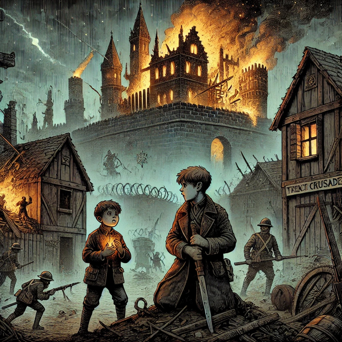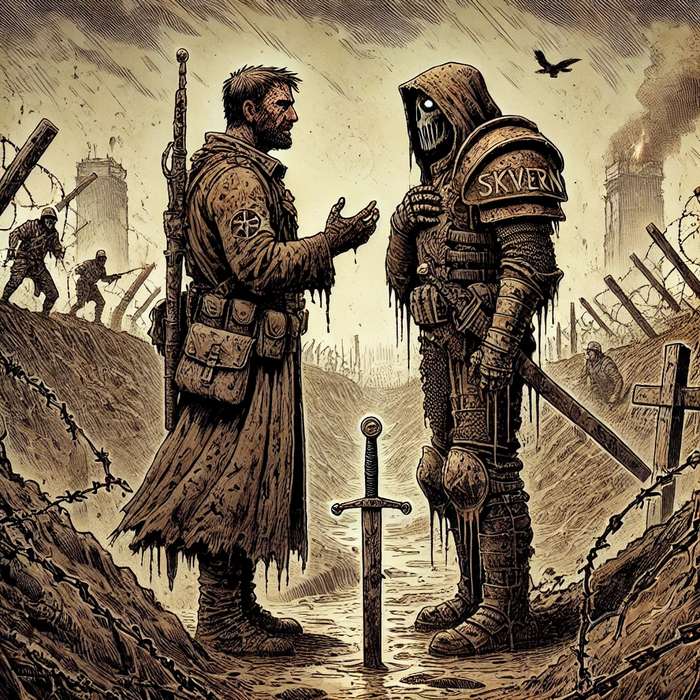 Первый день в траншеях стал для него шоком. Вместо уверенных и благородных солдат он встретил измождённых людей с пустыми глазами. Их броня была покрыта грязью, а лица — страхом. Азарий учился выживать среди свиста пуль, ядовитого газа и постоянного дождя. Вода заполняла траншеи до колен, превращая их в болота. Запах разложения и химикатов наполнял воздух, а крики умирающих никогда не прекращались.