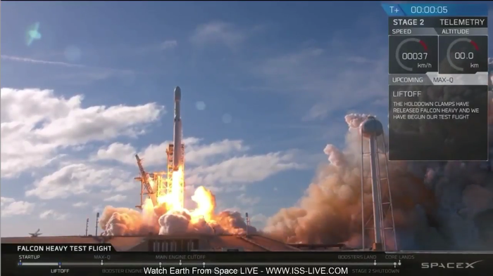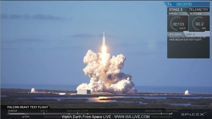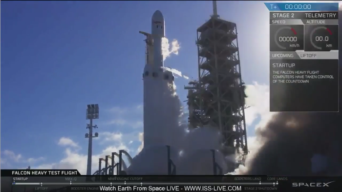 В грузовом отсеке Falcon Heavy отправлен личный автомобиль Илона Маска – красный Tesla Roadster, внутри на повторе будет играть песня David Bowie – Space Oddity.