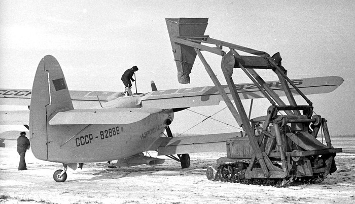 Самыми первыми к выполнению АХР на антоновском биплане приступили пилоты 92-го авиаотряда Украинского управления ГВФ (командир Н.С.Зидрашко), которые в мае 1950 г. получили Ан-2 No.10147309 - девятую машину первой серии. В течение лета летчики отряда, осваивая "Аннушку", выполнили на ней 812 учебных полетов под руководством прибывших из НИИ ГВФ летчика-испытателя Г.И.Лысенко и ведущего инженера Н.М.Зазимко. С наступлением осени они приступили к полетам на АХР в колхозах и совхозах Киевской области. А с весны 1951 г. началось массовое использование Ан-2 на химработах в других районах Украины. Если в 1949-51 гг. в республике авиаподкормку провели на площади 400 тыс. га, то за один только 1953 г. - на 1, 5 млн. га. Удобряя озимые, каждый Ан-2 заменил 5 тракторов, 15 сеялок и 6 автосамосвалов, при этом удельные затраты снизились на 30 %.