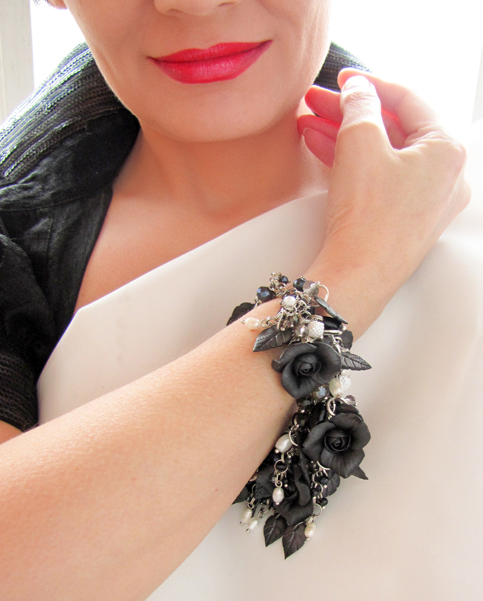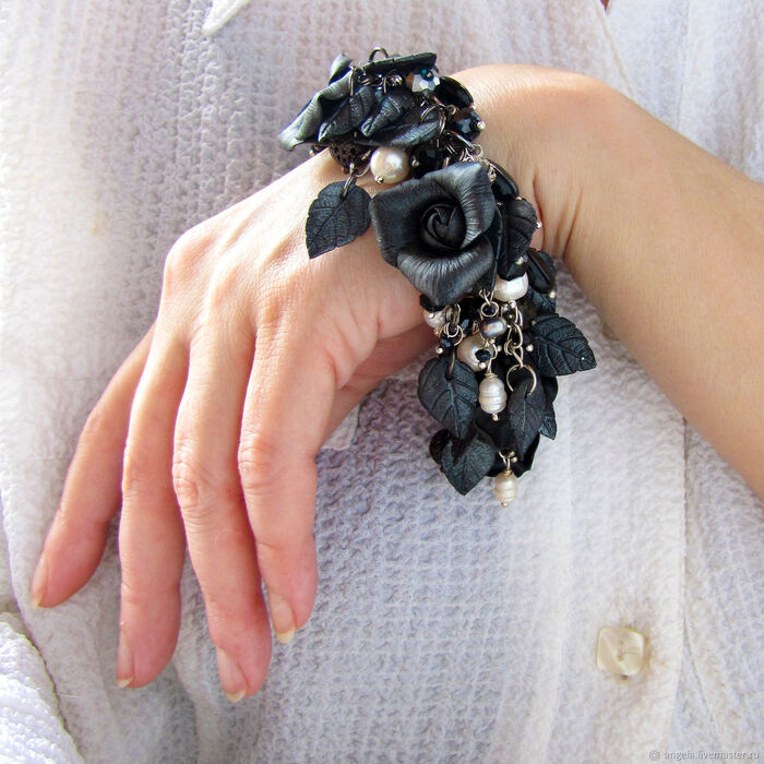Каскадный вечерний браслет с цветами и листьями из полимерной глины, с натуральными жемчугом и кварцем