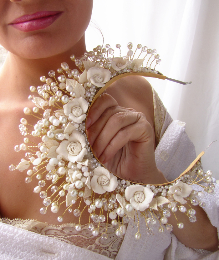 Две короны, современный кокошник, много фоток каскадного браслета и подробное описание - как изготовлена белая свадебная корона