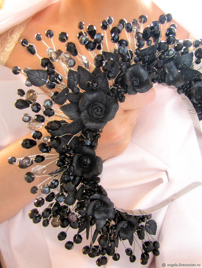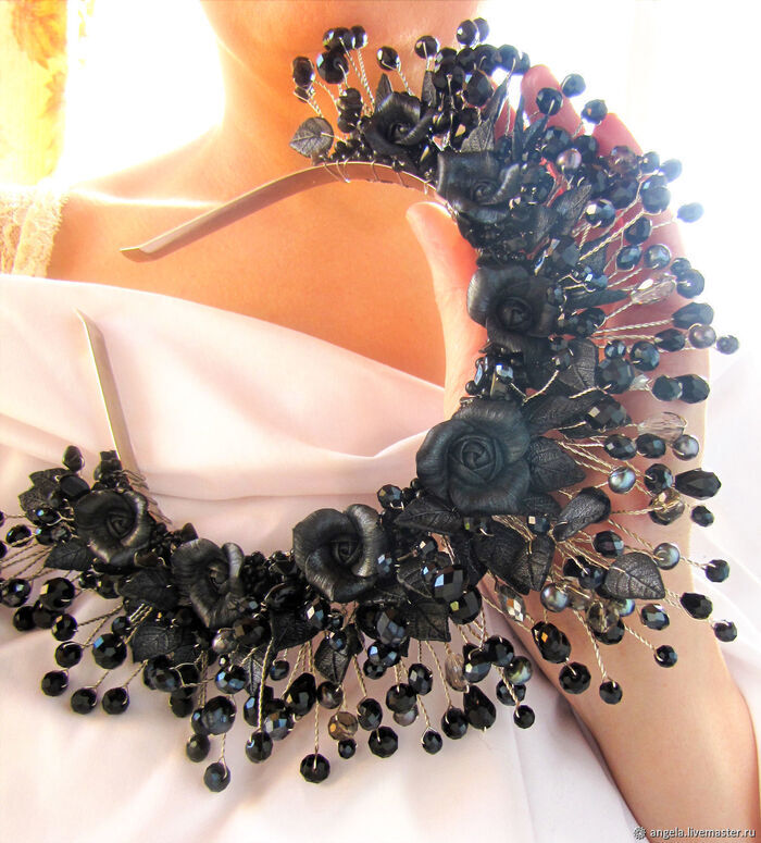 Черная готическая корона, сделанная в той же технологии, тут еще не пришита репсовая лента в основание и видны вышеупомянутые витки пришивания.