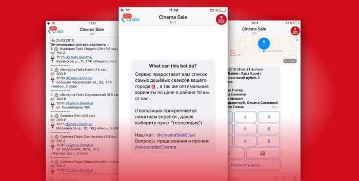Появился на сервис по подбору сеансов "Cinema sale" , который сортирует и выдаёт самые дешёвые сеансы в районе 10км от пользователя , а так же рейтинг самых дешевых сеансов на нужный фильм по всему городу.