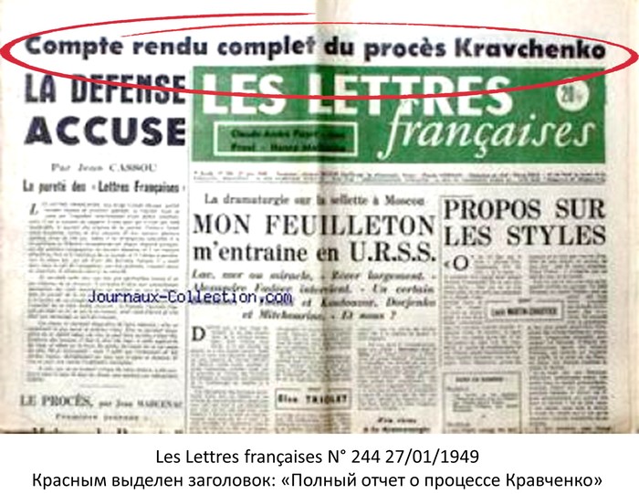 Судился Кравченко с газетой “Les Lettres françaises”, редактором которой был Луи Арагон. Выдвинул иск на три миллионов франков.
