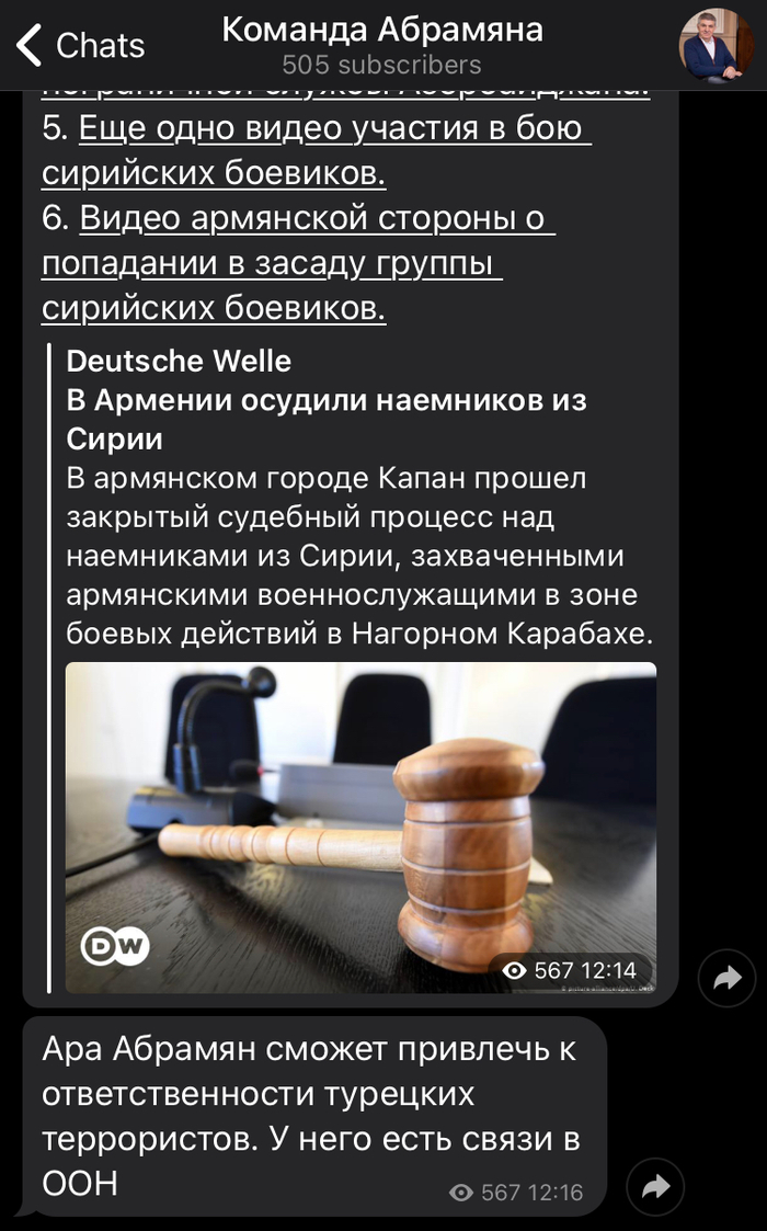 Так 6 мая в одном из неофициальных Телеграмм-каналов, связанных с деятельностью структур Абрамяна появилось сообщение: «Ара сможет привлечь к ответственности турецких террористов. У него есть связи в ООН».