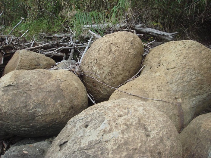 Конкреция-это твердая, компактная масса вещества, образованная осаждением минерального цемента в промежутках между частицами и находящаяся в осадочных породах или почве. Конкреции часто имеют яйцевидную или сферическую форму, хотя встречаются и неправильные формы. Если присмотреться как следует, можно заметить на поверхности конкреций полосчатый рисунок. Это — косая слоистость песчаников, слагающих пласт