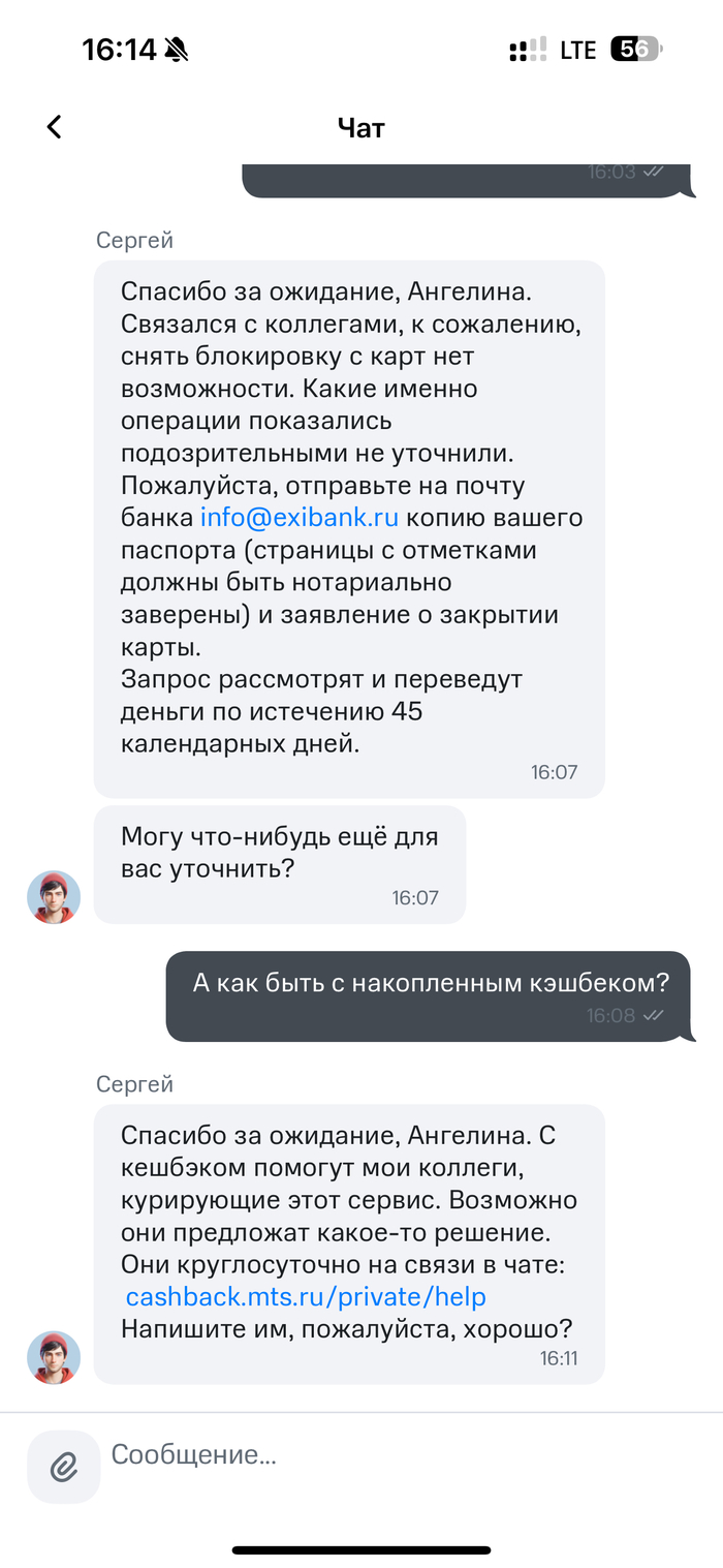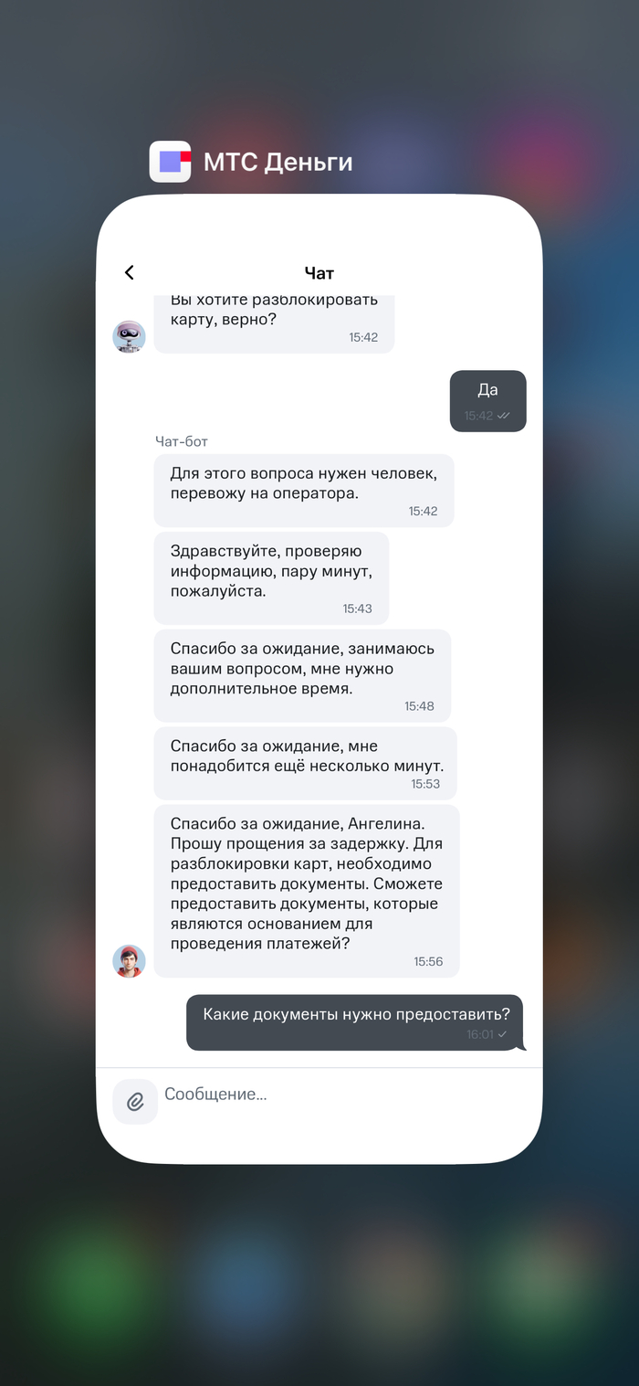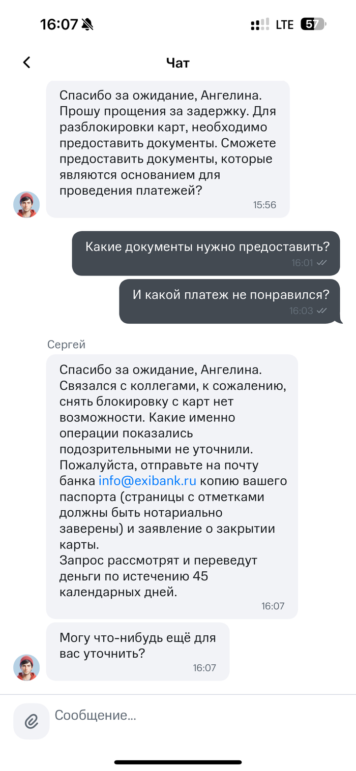 4 дня назад я закрыла накопительный счет (процентная ставка была 22-23%) и перевела деньги на другой счет под примерно таким же %. Эти 4 дня я активно тратилась на транспорт, сделала заказ на маркетплейсе и бац, сегодня мне карты блокируют. Пишу в поддержку прошу объяснить в чем дело и разблокировать мне карты. Сначала представитель поддержки пишет, что необходимо предоставить документы. Я спрашиваю, какие именно документы нужны (чеки, паспорт, скрин заказа, что конкретно-то?).