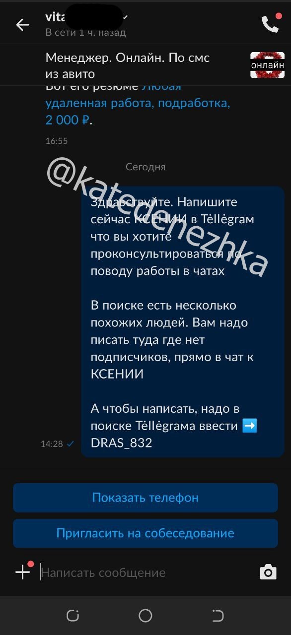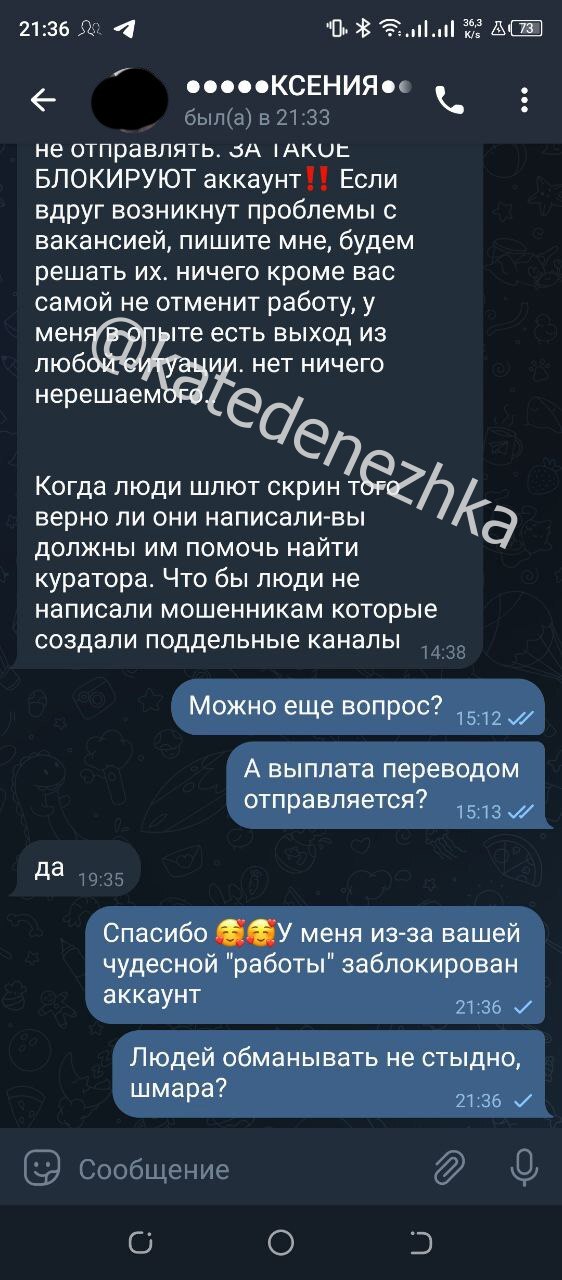 Однако тогда я этого не знала и сочла это ещё одним подтверждением того, что передо мной честный работодатель. Уже через 4 часа к вечеру я обнаруживаю, что мой аккаунт Avito, в котором у меня подтверждены все данные, навсегда заблокирован (потом я много раз пробовала восстановить его, но тщетно). Я в возмущении пишу Ксении (так предположительно зовут эту мошенницу), но она уверяет, что это на время, и что аккаунт восстановят, и предлагает выплатить мне двойное вознаграждение за первый день работы в качестве компенсации, а также деньги за публикацию объявления – 8500₽. Меня это сразу напрягло, но почему-то в том момент я решила довериться ей и согласилась.