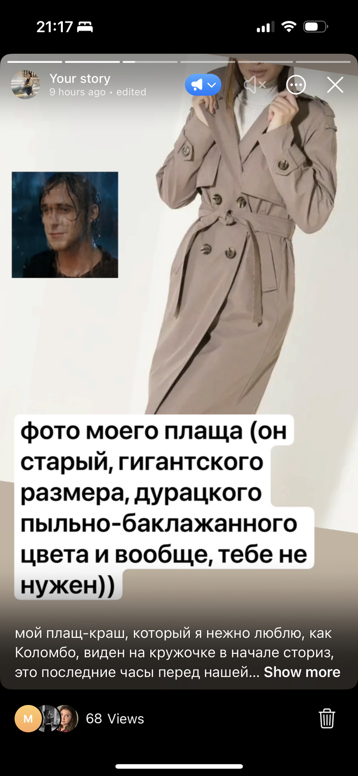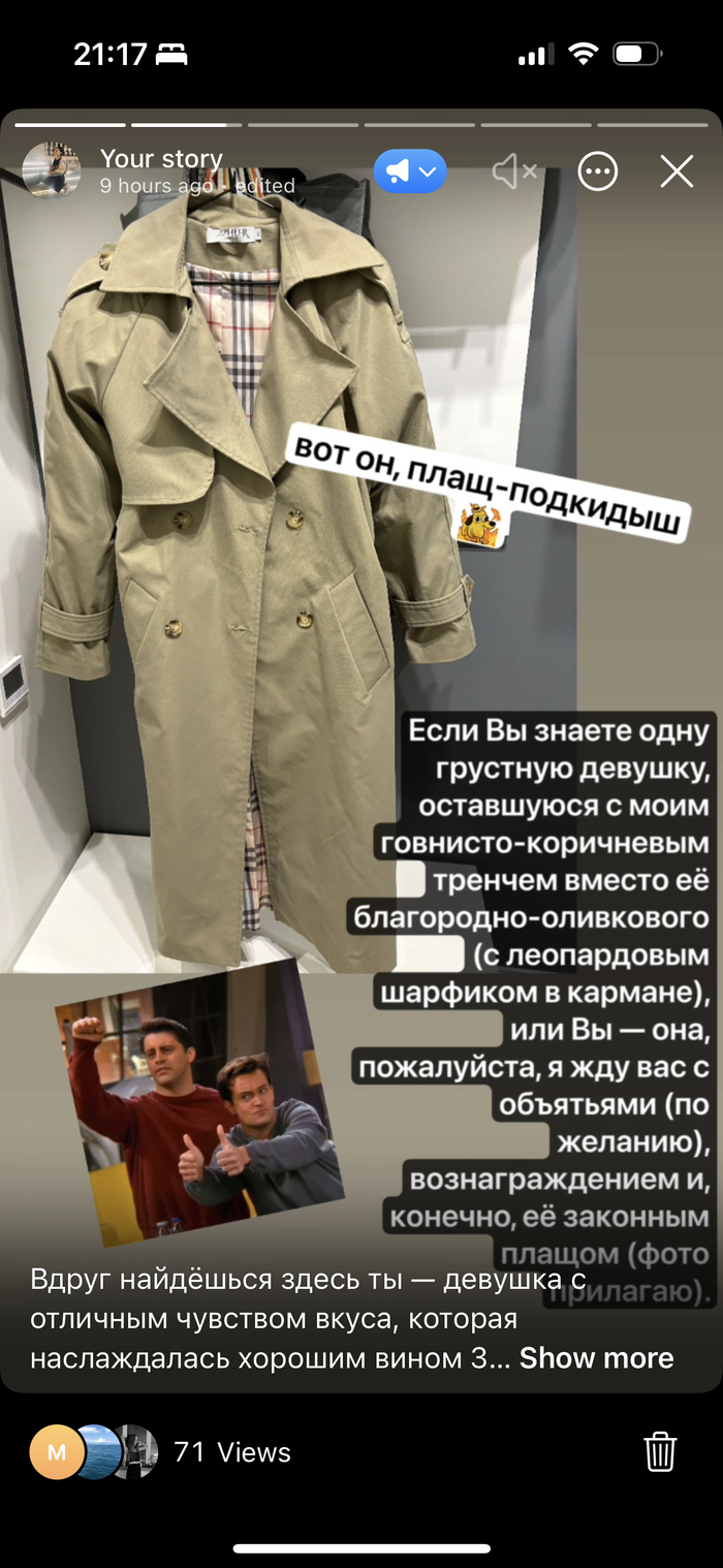 Если Вы знаете одну грустную девушку, оставшуюся с моим говнисто-коричневым тренчем вместо её благородно-оливкового (с леопардовым шарфиком в кармане), или Вы — она, пожалуйста, я жду вас с объятьями (по желанию), вознаграждением и, конечно, её законным плащом-подкидышем (фото прилагаю). Фото моего плаща (он старый, гигантского размера, дурацкого пыльно-баклажанного цвета и вообще, тебе не нужен)) — из кружочка в последние часы перед нашей с ним разлукой. ещё на всякий случай референсы с маркетплейса, мой примерно такой, только здоровенный оверсайз, сейчас уже не продаётся — вот такое старьё