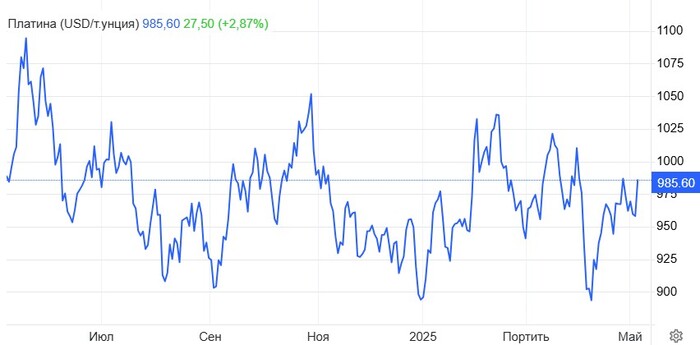 Фьючерсы на платину взмыли выше $980 за унцию в мае, отскочив от трехнедельного минимума в $959,5 в конце апреля, поскольку драгоценные металлы выросли на возобновлении спроса на безопасные активы.