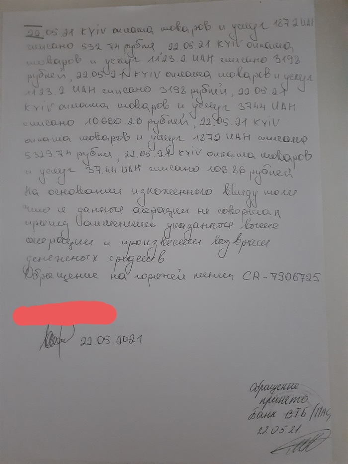 Позвонив на горячую линию по этому вопросу, я получил ответ что нужно заблочить карту и втб онлайн и валить писать заявление в полицию, но я решил действовать иначе и поехал в офис где составил следующее заявление (извините за почерк и ошибки)