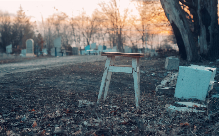 Катался на велике за городом, обратно путь лежит через кладбище, там заприметил табурет... В закатное время всё смотрится хорошо))