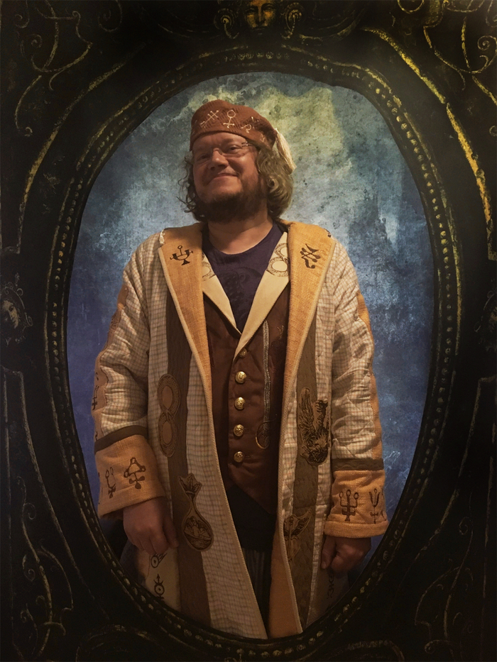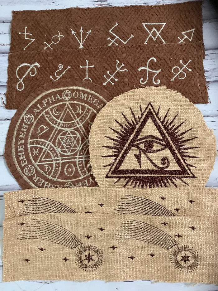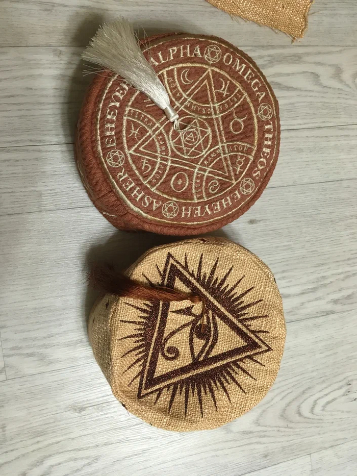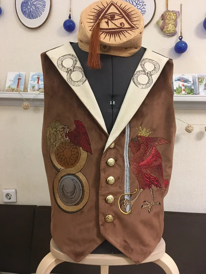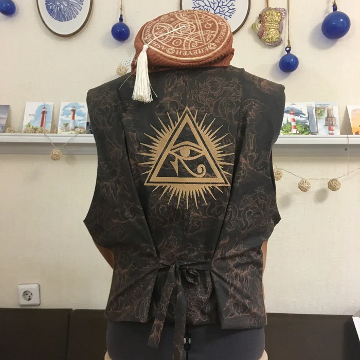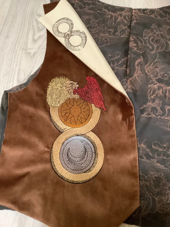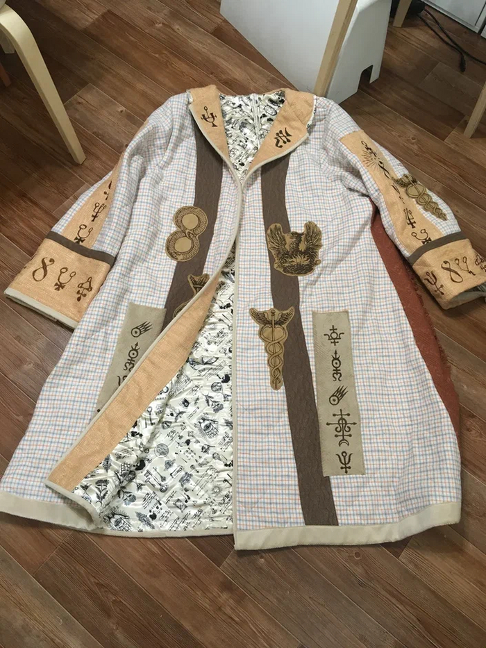 Пошли думать про детали. Решено было, что весь костюм покроет астрологическая и алхимическая символика. Даже для подкладки нашли подходящий арт и заказали печать по ткани. Простегали ее тонким утеплителем, получилось славно!