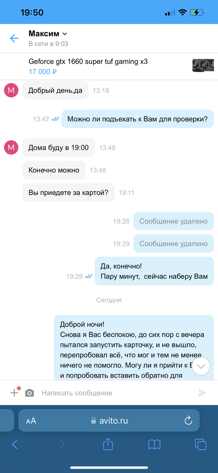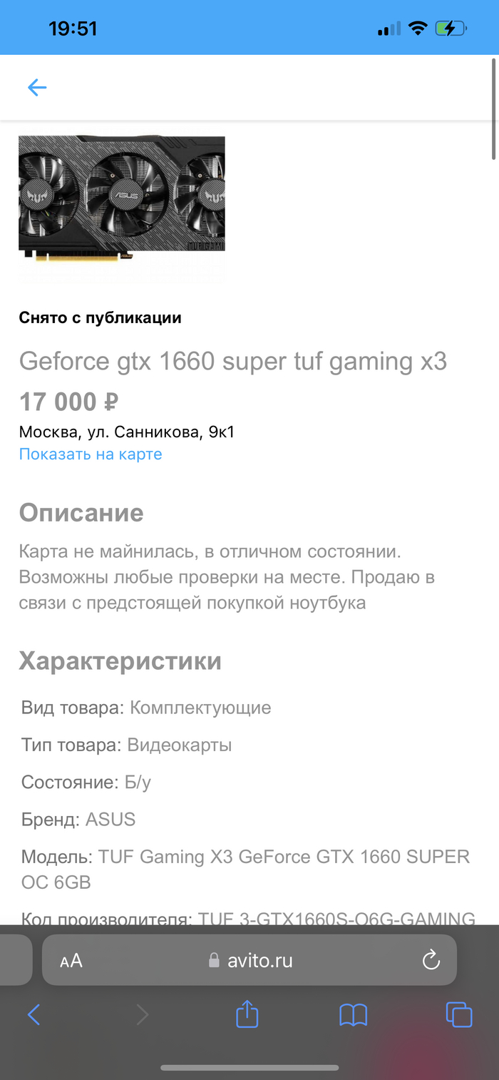 Вчера (05.07.2022) я таки решился рискнуть и залезть на платформу Авито (второй раз, где первый мой опыт был уже не самым удачным) для поиска и подбора подобающей видеокарты для себя. Остановился на GTX 1660 Super ценой в 17 000р. выбрав объявление более менее приличное из всех. Созвонился с продавцом, договорились о встрече на его территории по адресу ул. Санникова 9к1, 15-ый этаж, квартира 57. При встрече продавец был весьма вежлив, и зубы вроде как не заговаривал, поэтому подозрения были крайне малы. Важный момент, продавец упомянул о том, что карта не была ремонтирована, и даже не вскрывалась. Вежливо дал проверить работоспособность карты, проверял минут 30, карта показывала себя идеально. После проверки и всех развеянных сомнений, я сразу сказал, что беру. Продавец начал извлекать карту из корпуса, и как только он её извлёк, сказал, что сейчас продует её от пыли, и отошёл на кухню, где я за ним не последовал ибо посчитал, что не красиво ходить по чужой квартире как у себя дома, буквально через пару же секунд он вернулся и вручил мне карту, однако это была уже другая абсолютно идентичная карта, но убитая, о чём я узнал естественно, но уже позже. Придя домой, вставив её в свой компьютер, сразу же начались проблемы, так как карта не завелась. Просидел я с ней 6 часов испробовав все возможные способы за исключением перепрошивки самой карты (К чему я бы и не прибегал ни при каких условиях). Сразу же отписал продавцу с просьбой вернуться и попробовать запустить её на его компьютере снова, на что он не ответил до сих пор. Сегодня утром, всё ещё грешил на свой системник, и поэтому собравшись посетил двух знакомых у которых мы попытались завести данную карту на двух разных системниках, но увы, попытки были тщетны, в этот момент уже можно было не размышлять о том, что это убитая карта. Придя домой, решив разобрать её дабы осмотреть её внутренности, мной было выявлено, что внешне карта казалась отремонтированной, так же на карте были заменены термопаста и термопрокладки.
