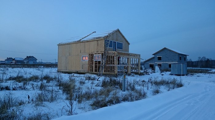 Начались заморозки, а крыши не было! Эти чудаки решили собрать ее на земле и поднять наверх краном, а то, что кран стоит 8000 за вызов им было пофиг, а я не был предупрежден. В итоге вызвали они кран, поставили половину крыши и на этом мы разошлись с ними.