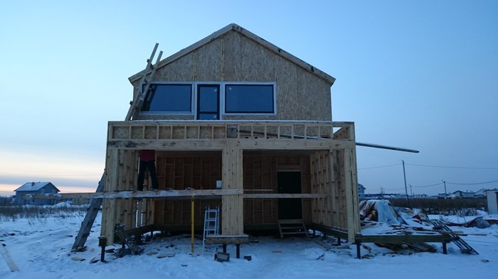 Вторую половину тоже пришлось ставить краном (не разбирать же ее теперь!), ставили уже сами. Окна и двери поставили уже с первым снегом. На этом строительный сезон закончился.
