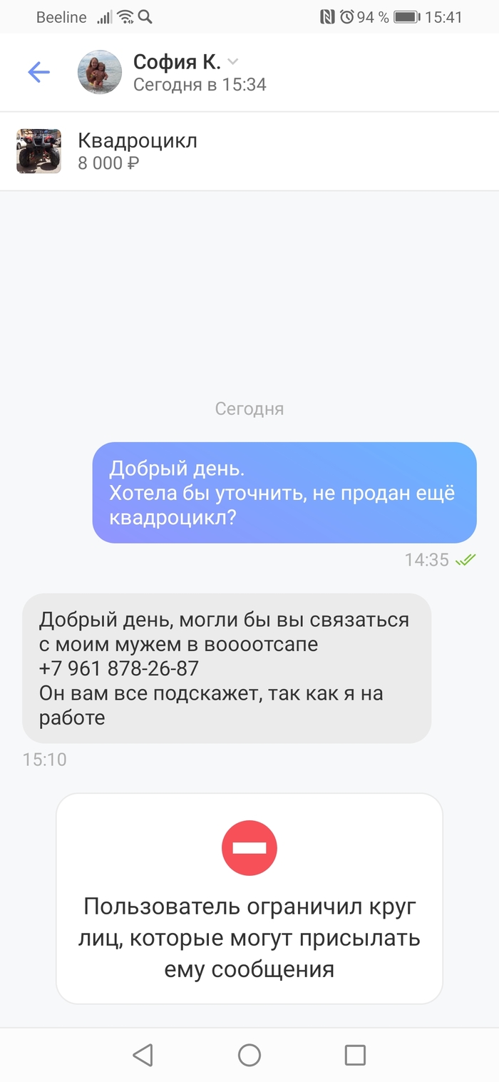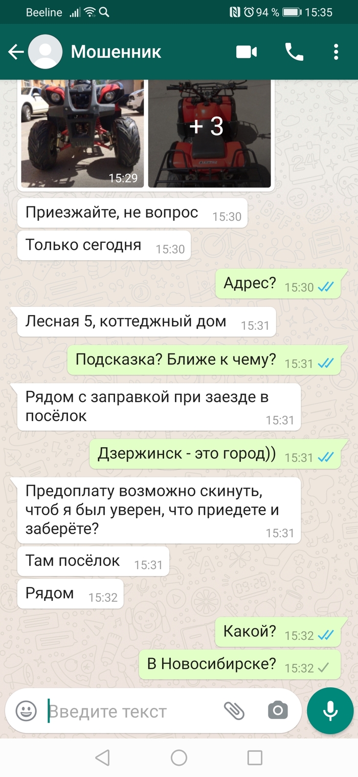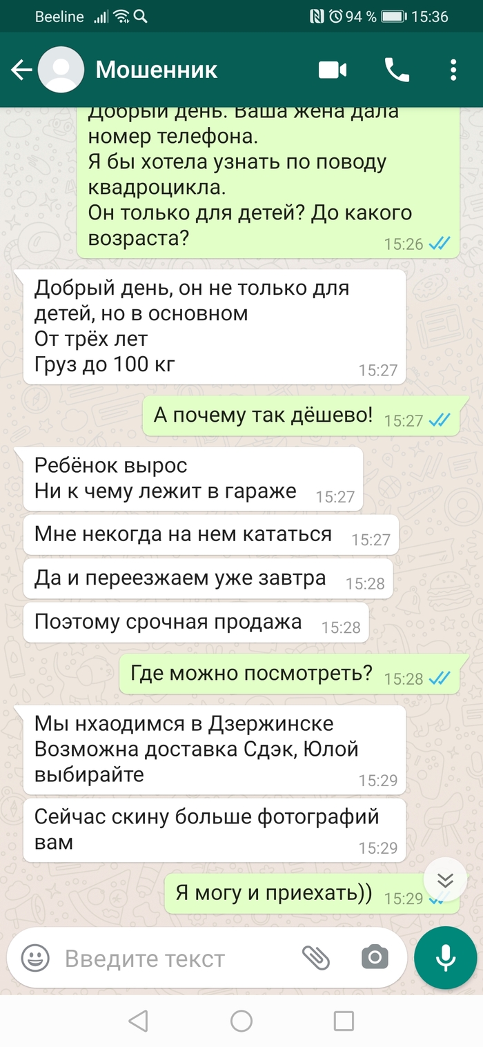 Ну, так и есть. Развод. Номер телефона зарегистрирован в Новосибирске, а объявление в Нижнем Новгороде. Хотя это ещё ни о чем не говорит. Мало ли, переехал человек со своим номером. Пишу в WhatsApp, отвечают быстро. Якобы, ребёнок вырос, вот и продают.