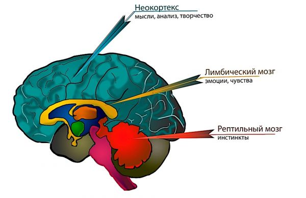 Во-первых, базовый, древний мозг (иногда его называют мозгом рептилии). Он концентрируется на том, что необходимо для выживания: поиск еды, спаривание, побег от опасности, атака.
