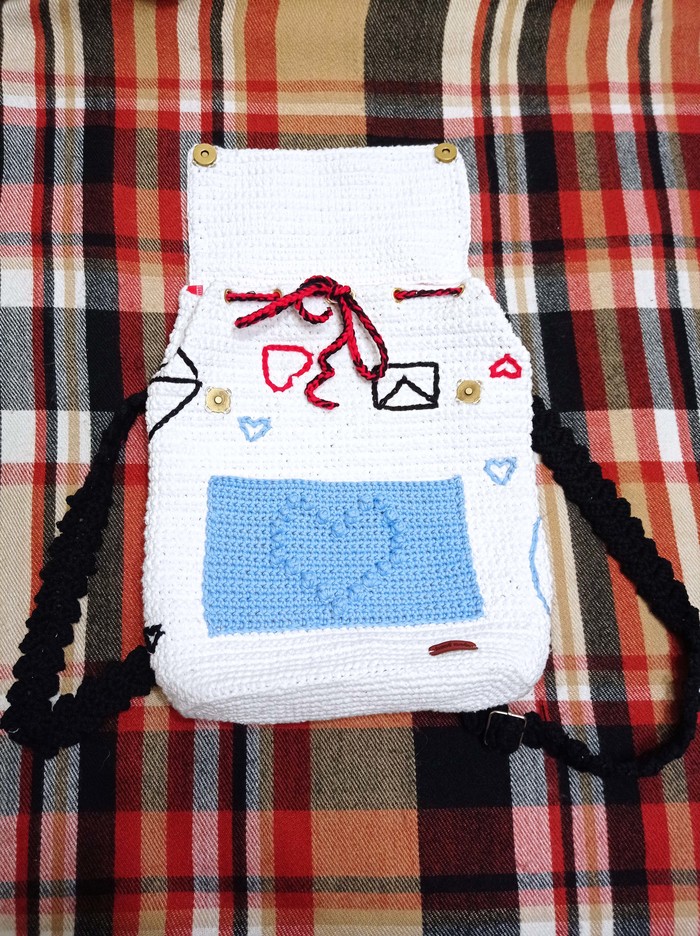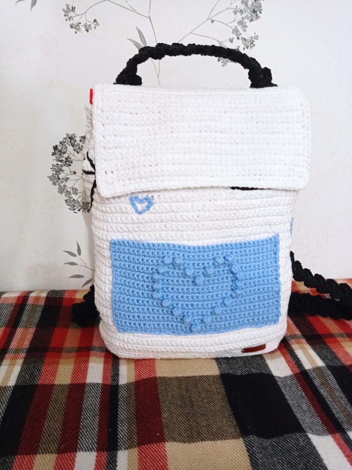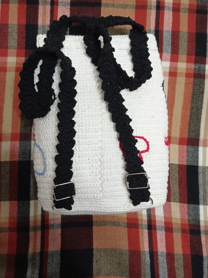 - пряжа YarnArt eco-cotton (85% хлопок и 15 % полиэстер) цвет 760 (белый) - для самого рюкзака (ушло 2 мотка);