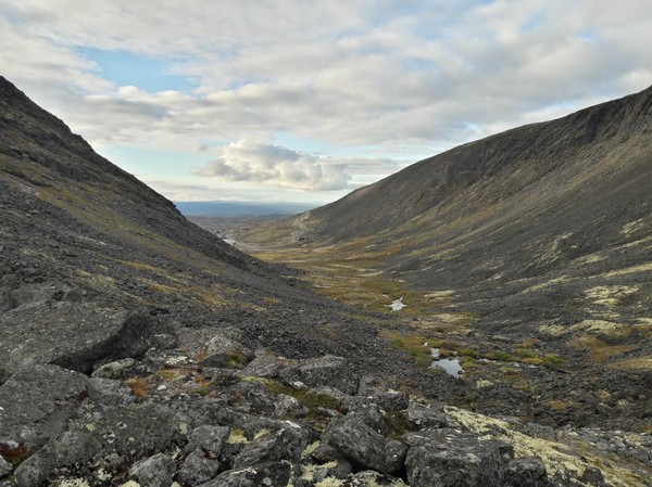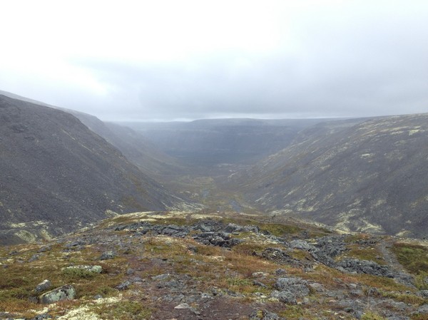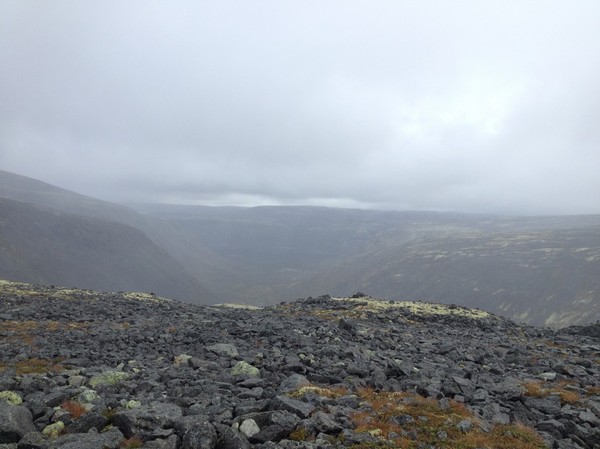 Все выше и выше - и в конце открывается обширная каменная равнина с островками из земли и ягеля. Сбиться с пути тяжело - нужно просто идти прямо, хотя ни тропинка, ни валуны этого не позволяют, и приходится петлять, выбирая маршрут поровнее и камни поудобнее. Мы шли по равнине сквозь морось и слабый туман, и через пару часов от ГОКа подошли к месту, где равнина начала уверенное снижение между двух массивных гор, усеянных столь же дружелюбными булыжниками.